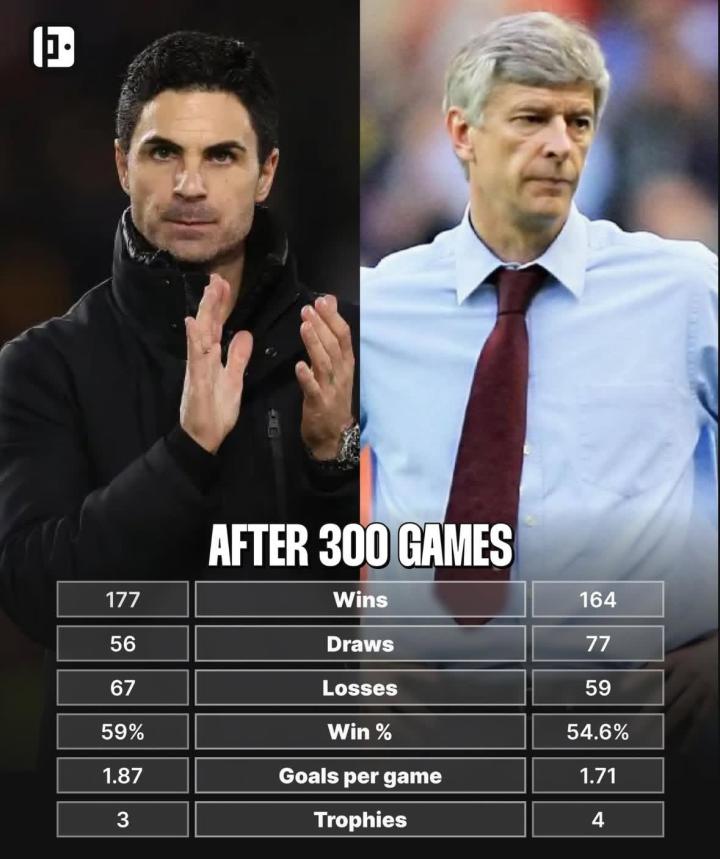 在完成了300场比赛的执教之后,让我们来对比一下阿尔特塔与传奇教练温格所取得的战绩: