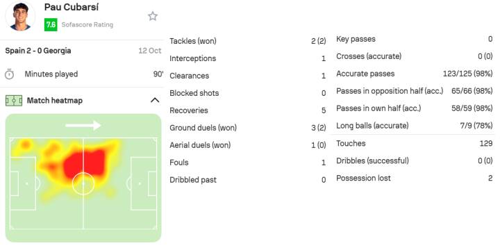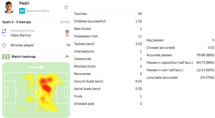 佩德里本场比赛尝试了1次盘带但未能成功,在防守端完成了3次抢断、1次拦截和1次解围,还5次夺回了球权。他共有95次触球,86次传球,其中包括5次关键传球,传球成功率达到了88%。