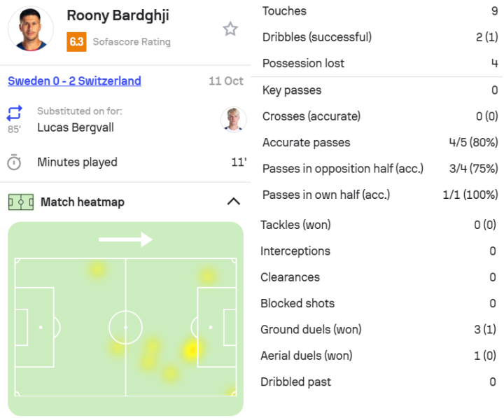 5. 巴尔德吉,瑞典对阵瑞士以0-2失利,第85分钟替补出场。