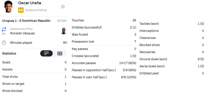 8. 乌雷尼亚,乌拉圭对阵多米尼加以1-0获胜,首发出场64分钟。